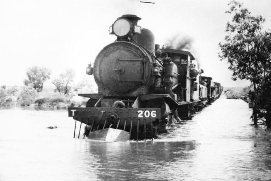 Ghan train in flooded creek (ABC Site)