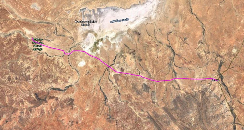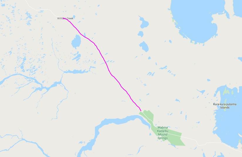 This route followed, broadly, that of some of the early explorers through this way, and was dictated by the availability of water in a series of naturally occurring springs. Because of available water, the Overland Telegraph line to Darwin and thence the rest of the world, was built along this route, in 1872.