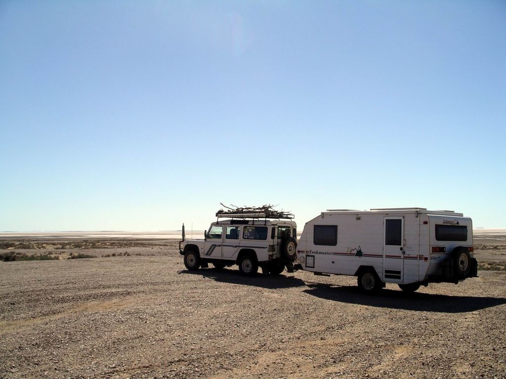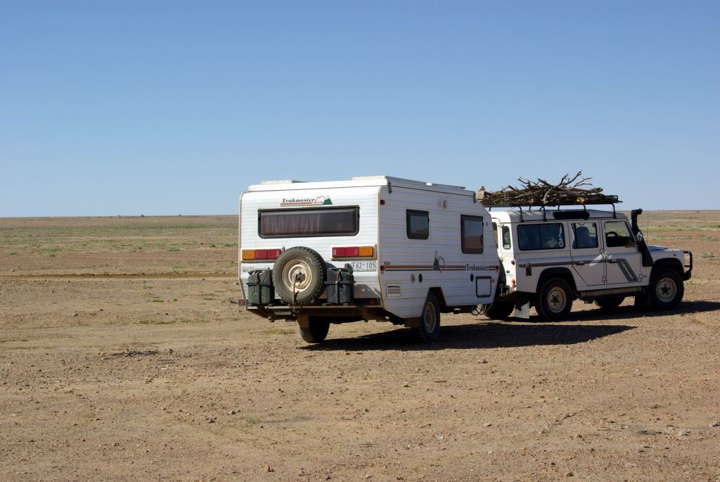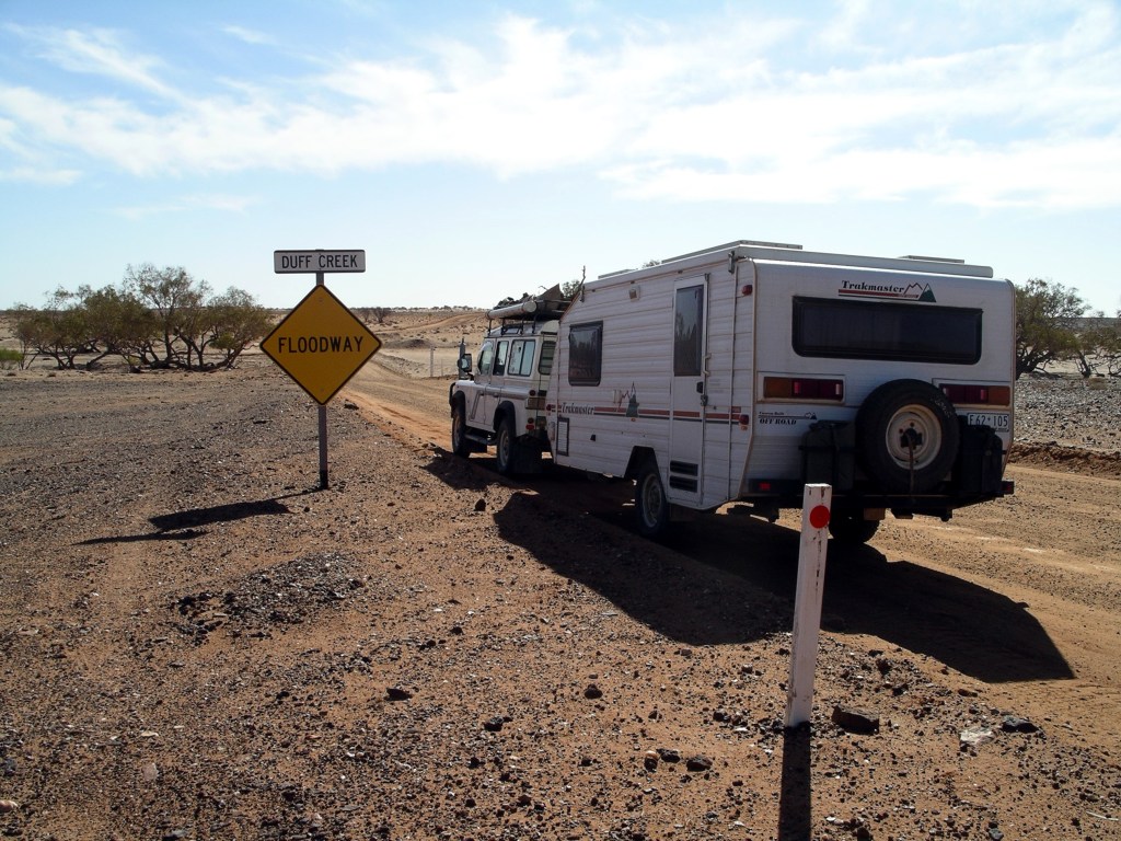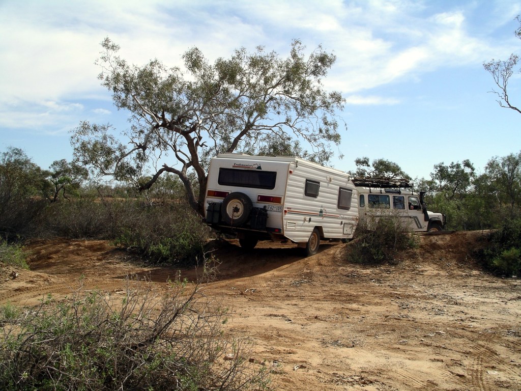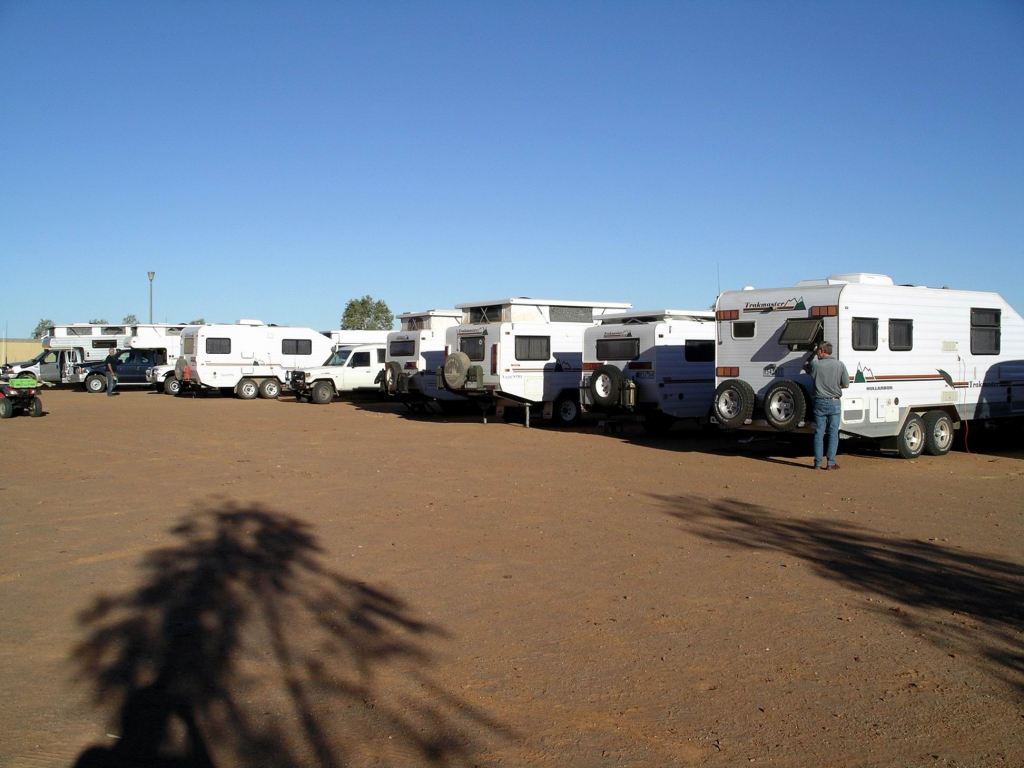 I received a big surprise when I walked back to the camp ground. Our formerly isolated van and Troopy were surrounded – by Trakmaster caravans! Ten of them had somehow managed to sneak into Dodge whilst I was otherwise occupied. It was like we had suddenly been cloned! It was the annual Trakmaster Trek – across the desert to Marble Bar in WA.
