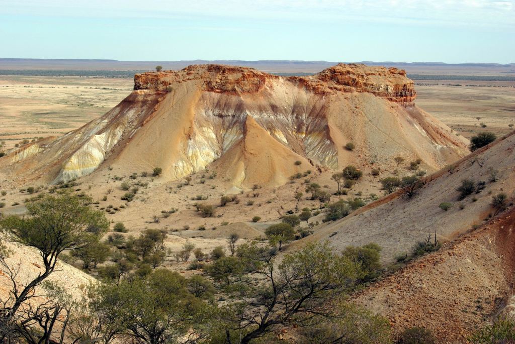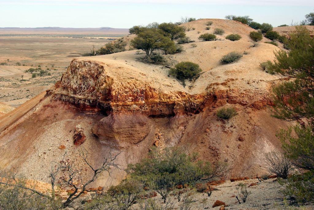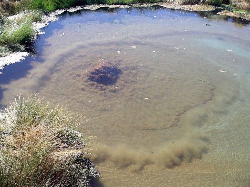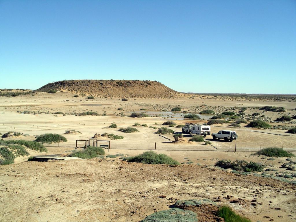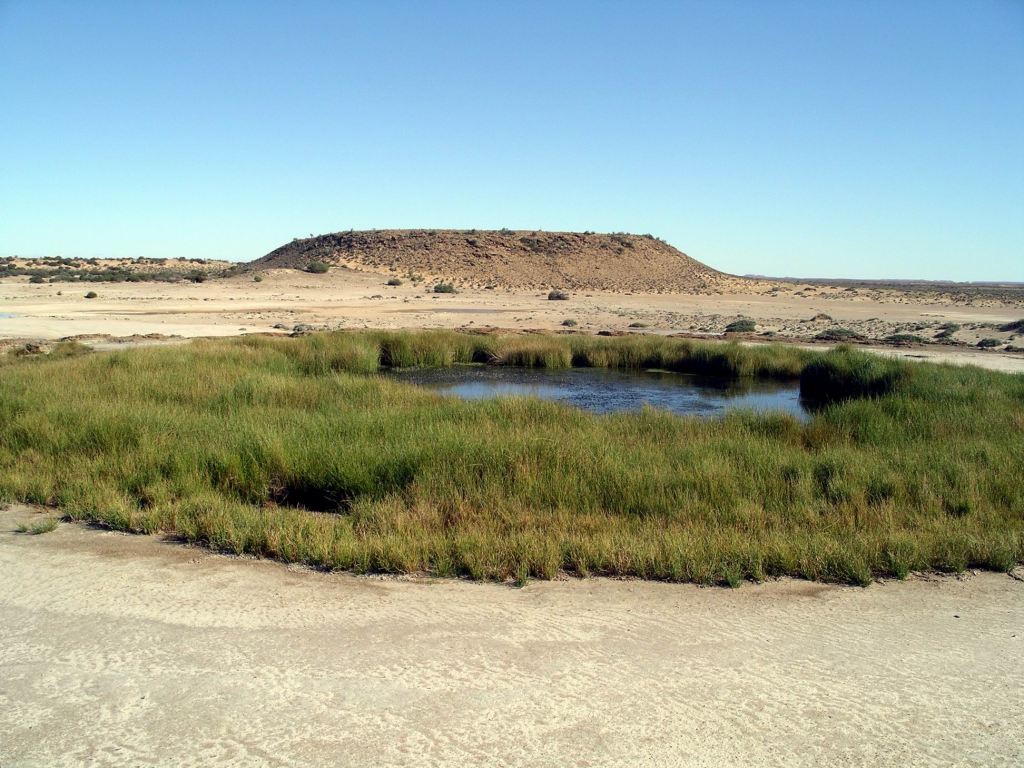 Mounds springs occur where minerals in the naturally occurring springs have, over time, been precipitated out by evaporation to create a mound, with the spring in the centre of the “cup” thus created. Hamilton Hill, in the distance from the two currently active springs, is an extinct one, and shows the size the mounds can reach.