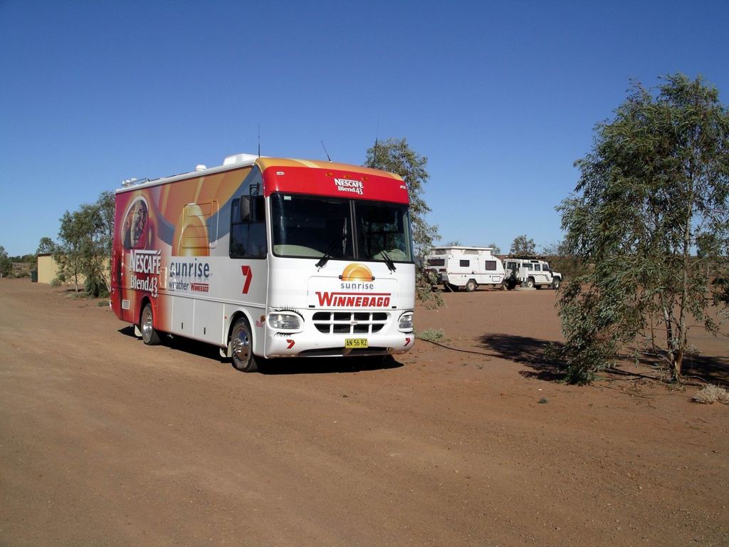 As we drove into William Creek, an unexpected sight was the Channel 7 (TV) Sunrise Bus. It had come to the hamlet to cover the start of the Great Australian Cattle Drive. This was the first that we had become aware that this was happening – and thus there would be a lot of extra people around.