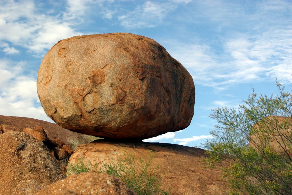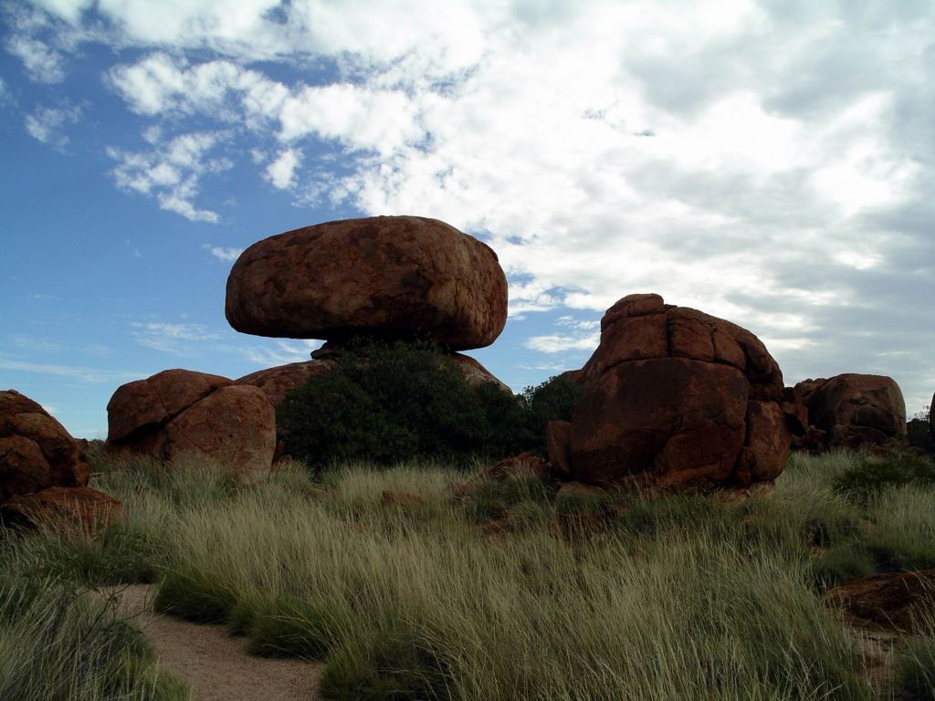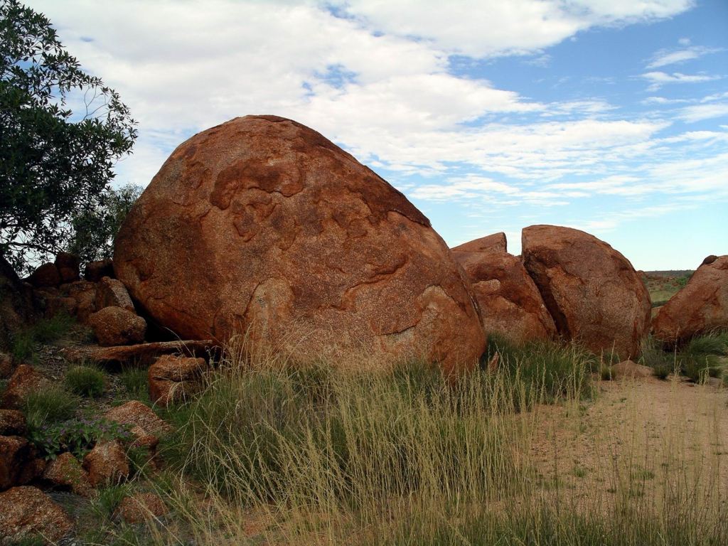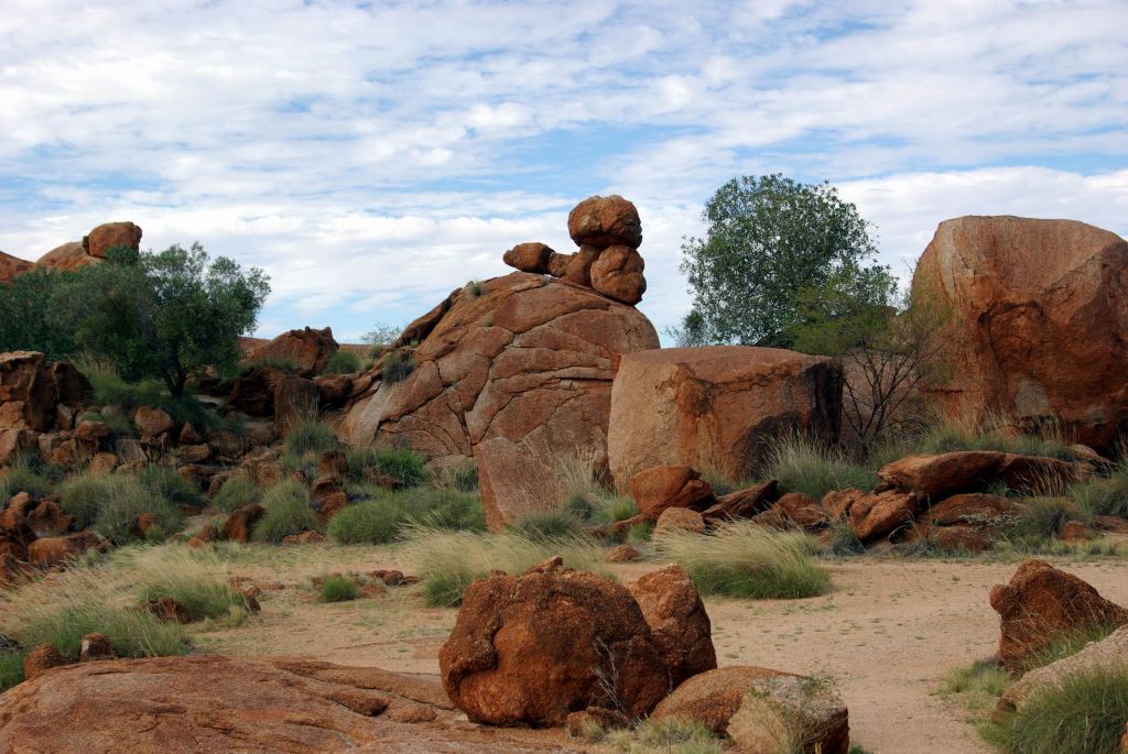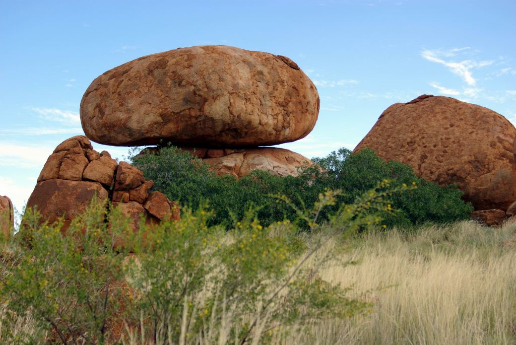The Devils Marbles were originally formed as molten granite intrusions up through weaknesses like cracks, into overlying sandstone, where the granite cooled. Over time, the sandstone has eroded away, leaving the blobs of granite as the feature we see today.