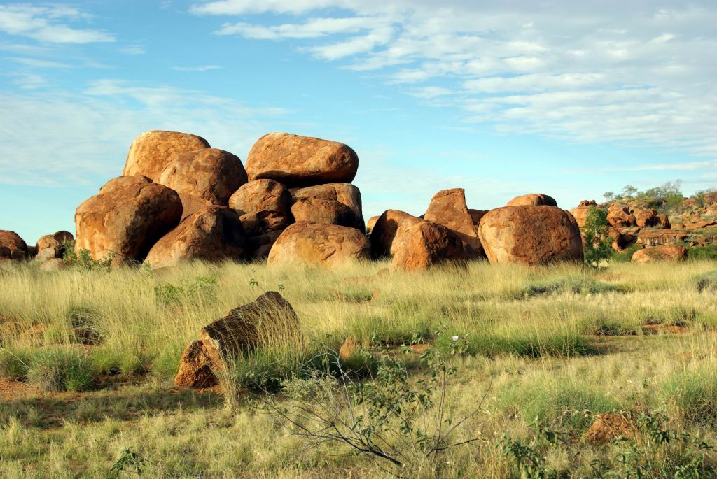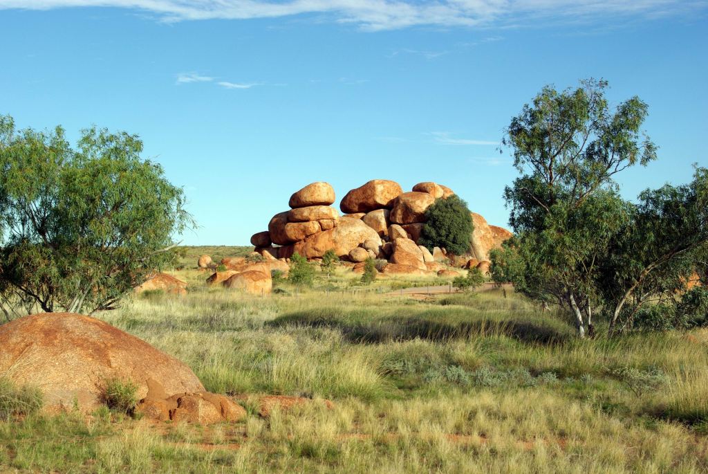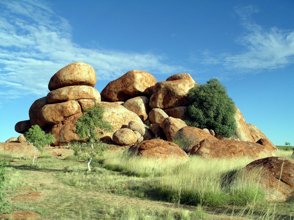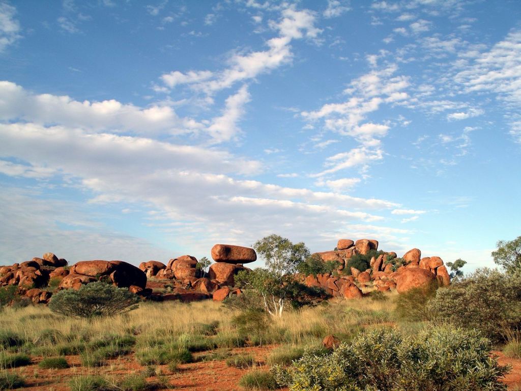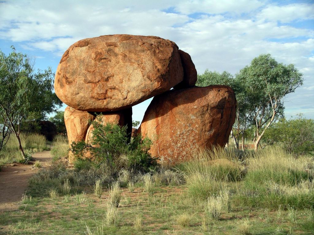 The Devils Marbles were originally formed as molten granite intrusions up through weaknesses like cracks, into overlying sandstone, where the granite cooled. Over time, the sandstone has eroded away, leaving the blobs of granite as the feature we see today.