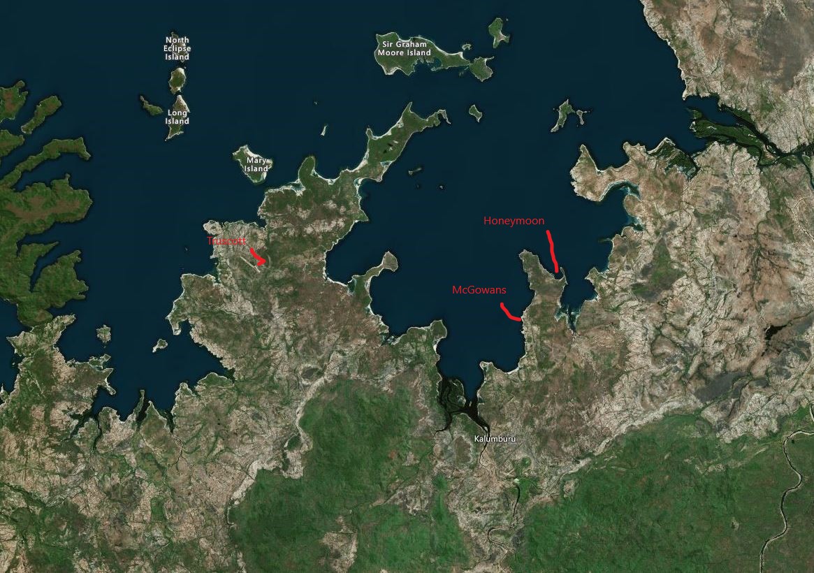 So they were having to run a couple of generators through the day, to keep all these cool. Meant the days were noisy for us, rather than peaceful. We thought that the men were filling the freezers with fish to take away with them. They went out every day with their boat, fishing. I thought there were considerable limits on taking lots of fish away, in these parts, with significant penalties if caught. It seemed that any such rules were not being applied here, even though Les was supposed to be some sort of Ranger. There were no apparent limits on the size of people’s catches, or the number of the same species kept, or even on whether the catch was of legal length. Open slather. From the number of campers here with boats and considerable freezer capacity, it would appear that Honeymoon had developed a reputation……..