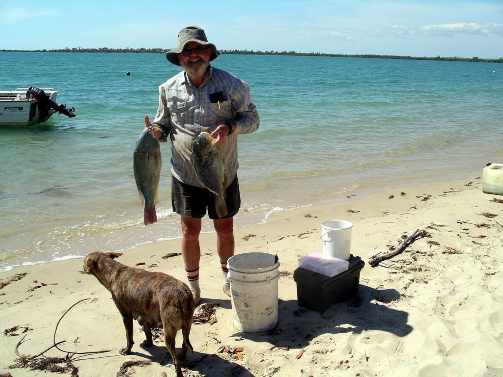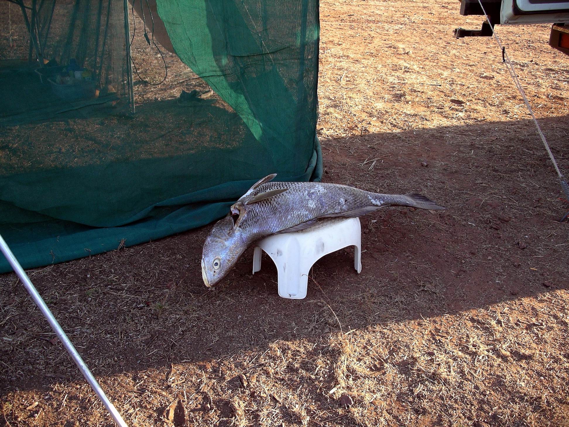 M had gotten chatting with some of the men from the next camp. She must have made a favourable impression, because I came back from a little wander around, to find a large jewfish laid carefully on her little foot step.