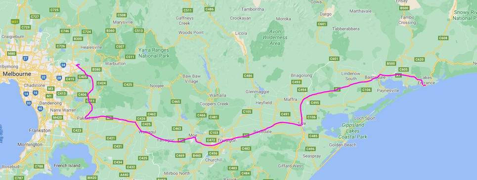 Took the “back” route to Gippsland, through Wandin, Yellingbo, Cockatoo, to Pakenham – winding, but little traffic and easy enough. Also much prettier than the alternative of using the roads closer to Melbourne, through the outer suburbs.