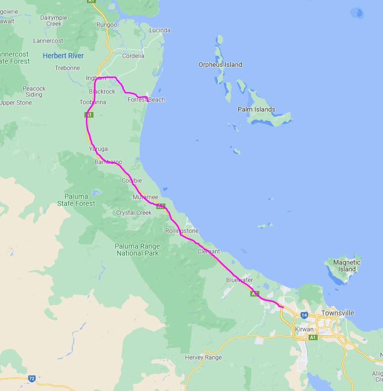 Wallaman Falls was mentioned as a possibility, but then we decided to go north instead, to take a look at Kurrimine. This had been mentioned to us as a great place to stay, by John’s nephew M. If we liked it, we could possibly go there for a while, as an alternative to spending all our remaining time at Forrest Beach.