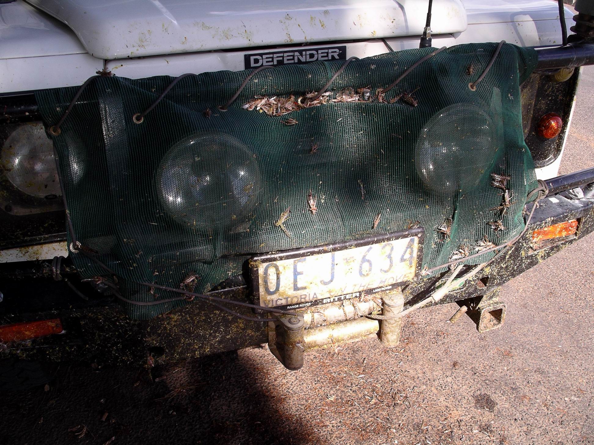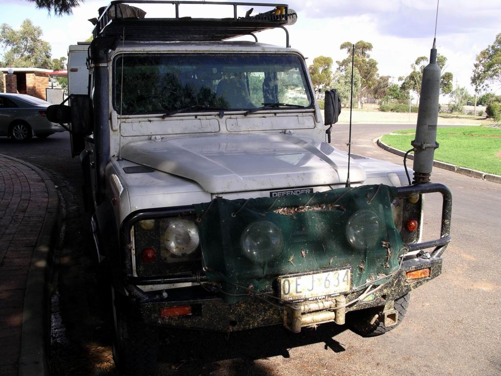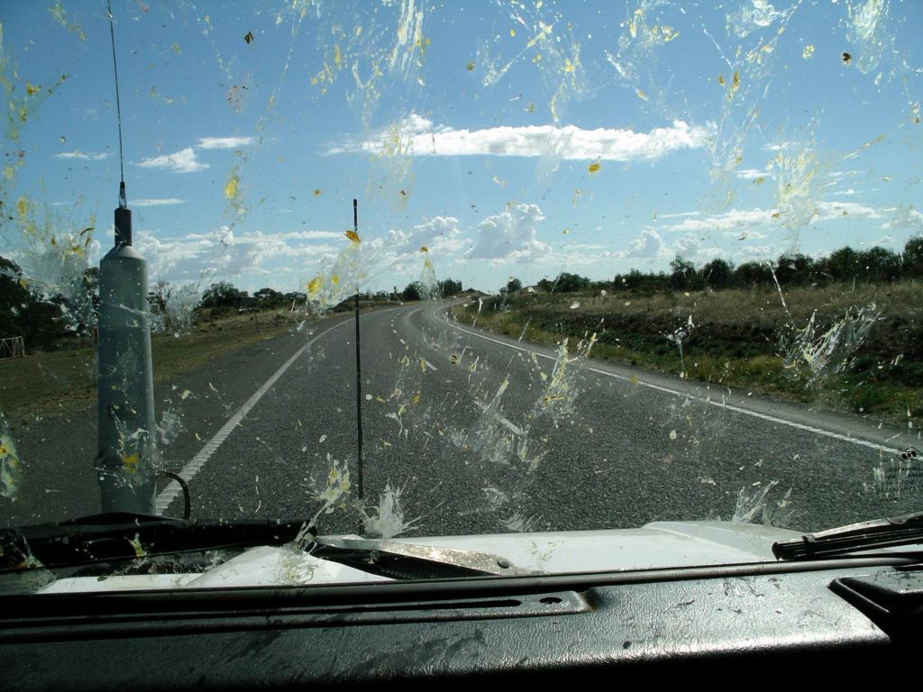 In places, there were thick swarms on the road. We slowed to about 65kmh – they didn’t seem to splat quite so badly then! Truck was “wearing” John’s home made shade cloth bug screen across the radiator grille, because we’d known in advance the pests were up this way. The hope was that this would prevent the build up of dead insects in the radiator body – which if bad enough can wreck the radiator. This one was new – like much of Truck now.