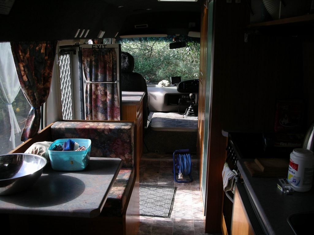 We went fairly early to bed. I tried sleeping with my head towards front of bus – much better, less squashed in. It was a cold night but we were quite cosy and warm. Dog decided to sleep on the floor between our beds, where I had put a small floor mat to protect our feet from cold lino in the mornings.