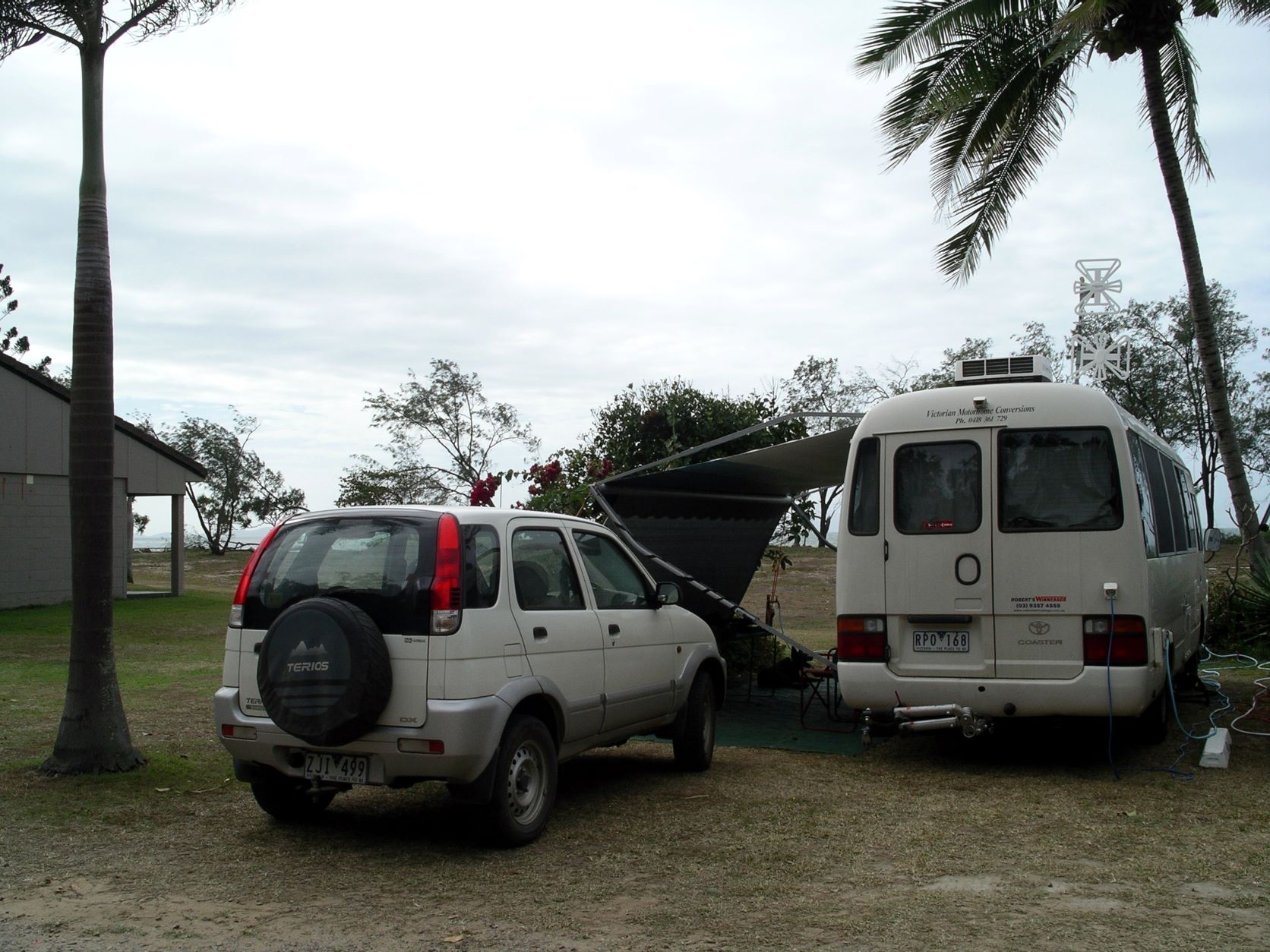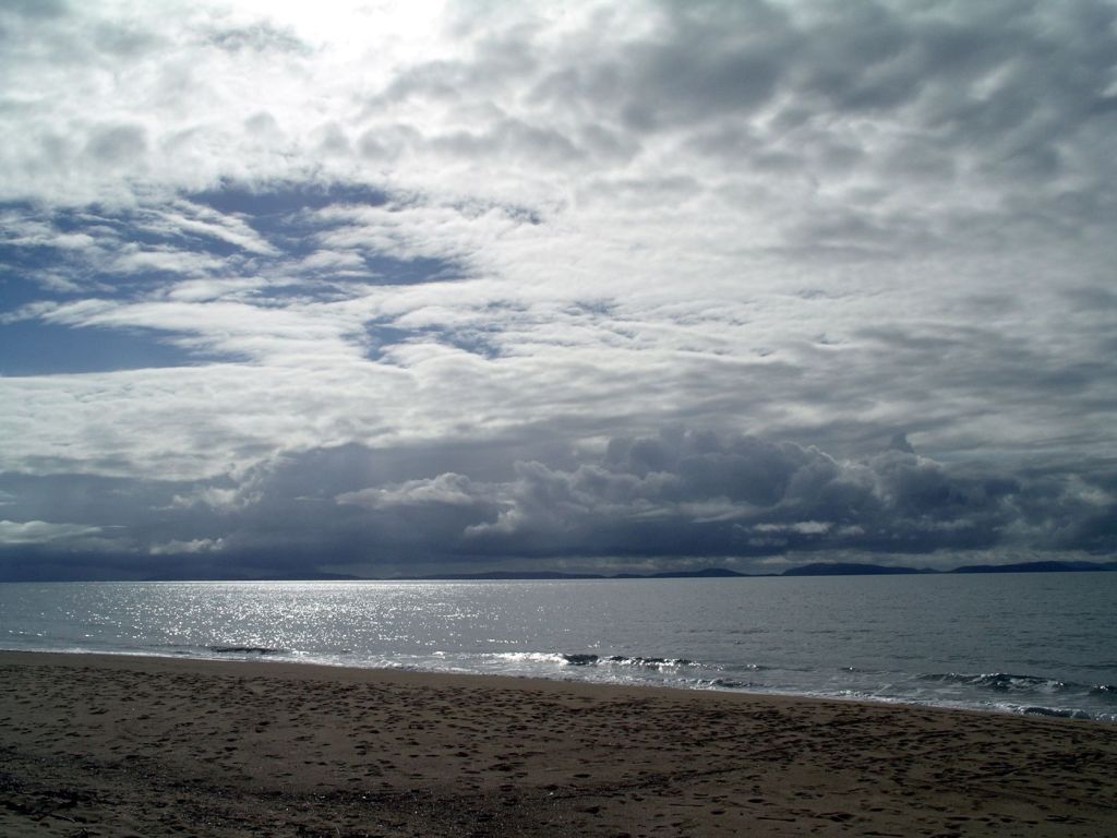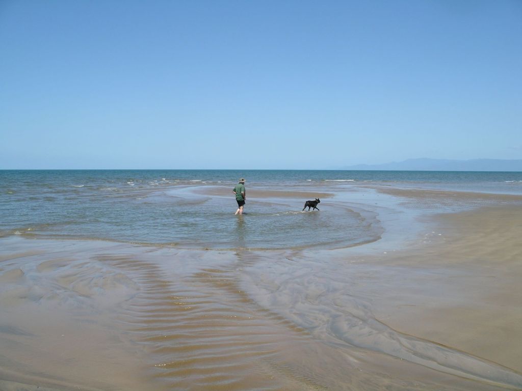 After breakfast, we did a lovely, long, beach walk with Couey. She cavorted in the shallow pools, rolled lots of times in the damp sand and generally had a good exercise workout. Despite the vigorous sand rolling, her coat is so thick that the sand does not penetrate too far. A brush down with the rubber horse grooming brush gets rid of it all, so we don’t have a problem with sand in Bus.