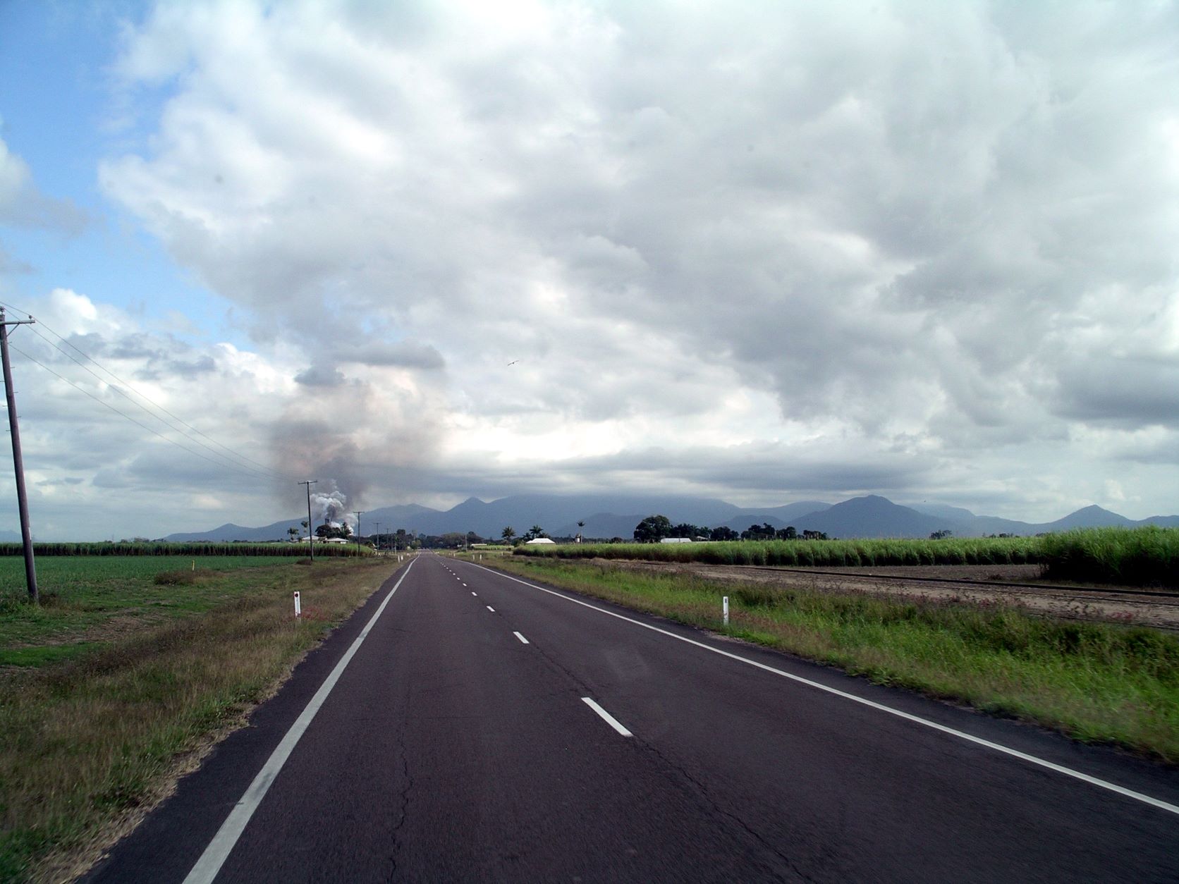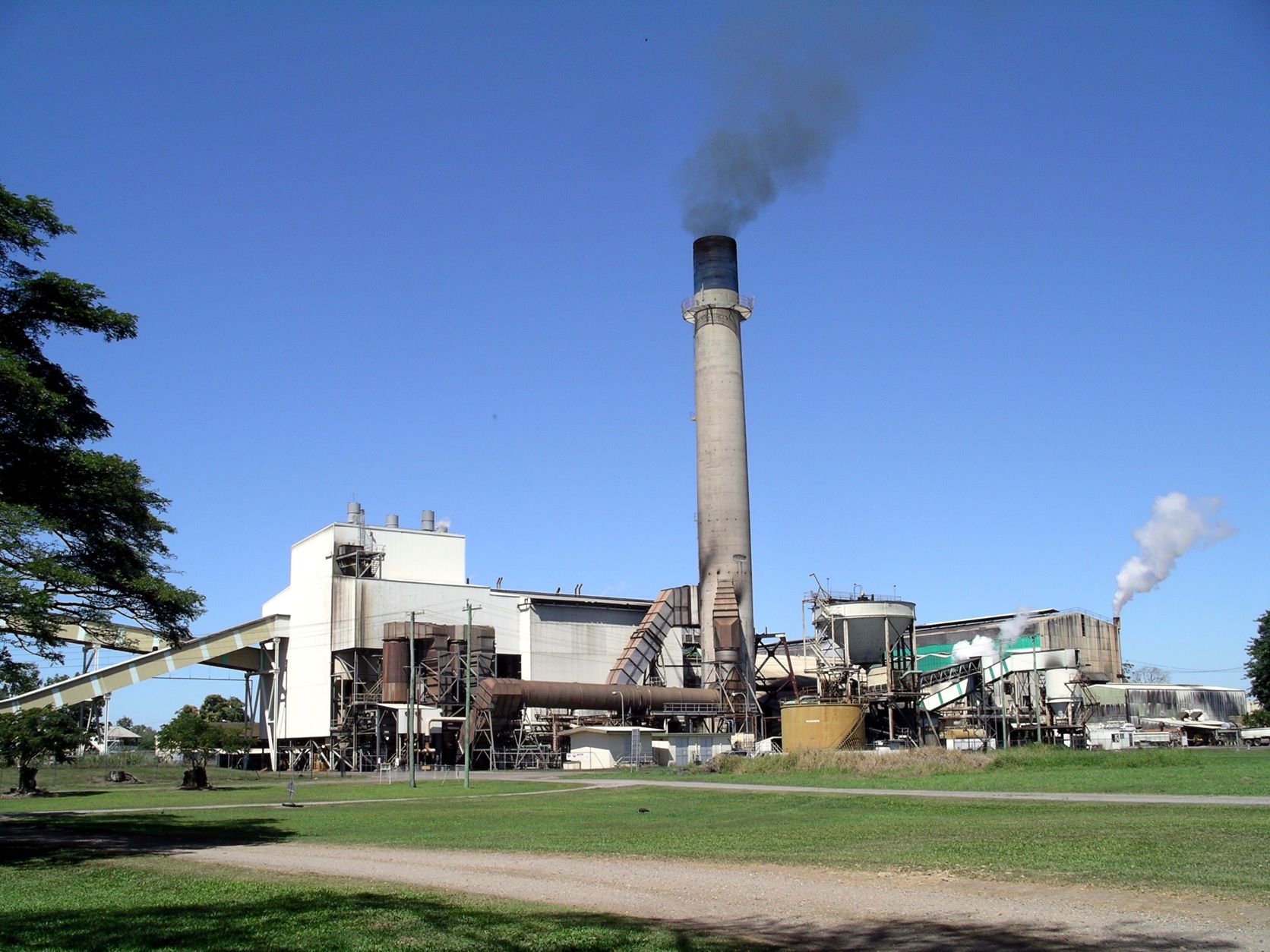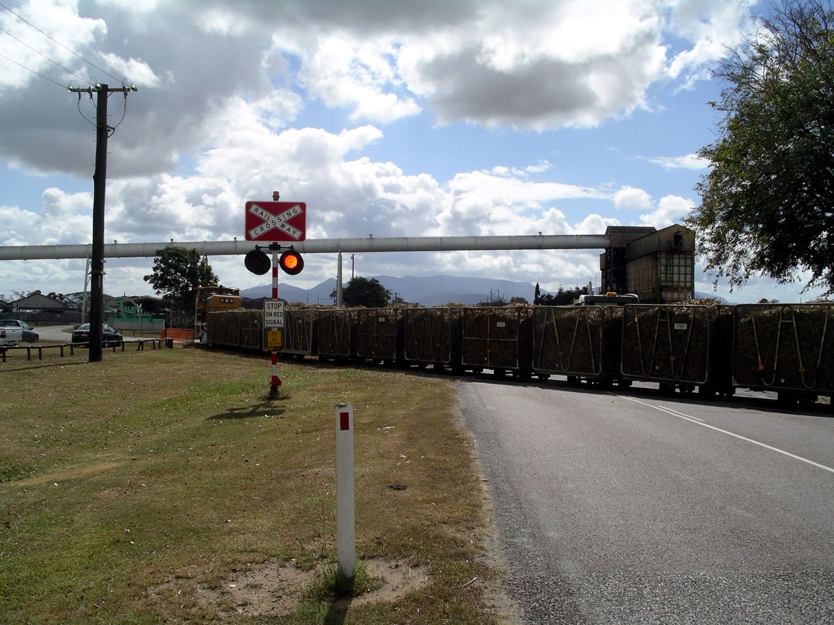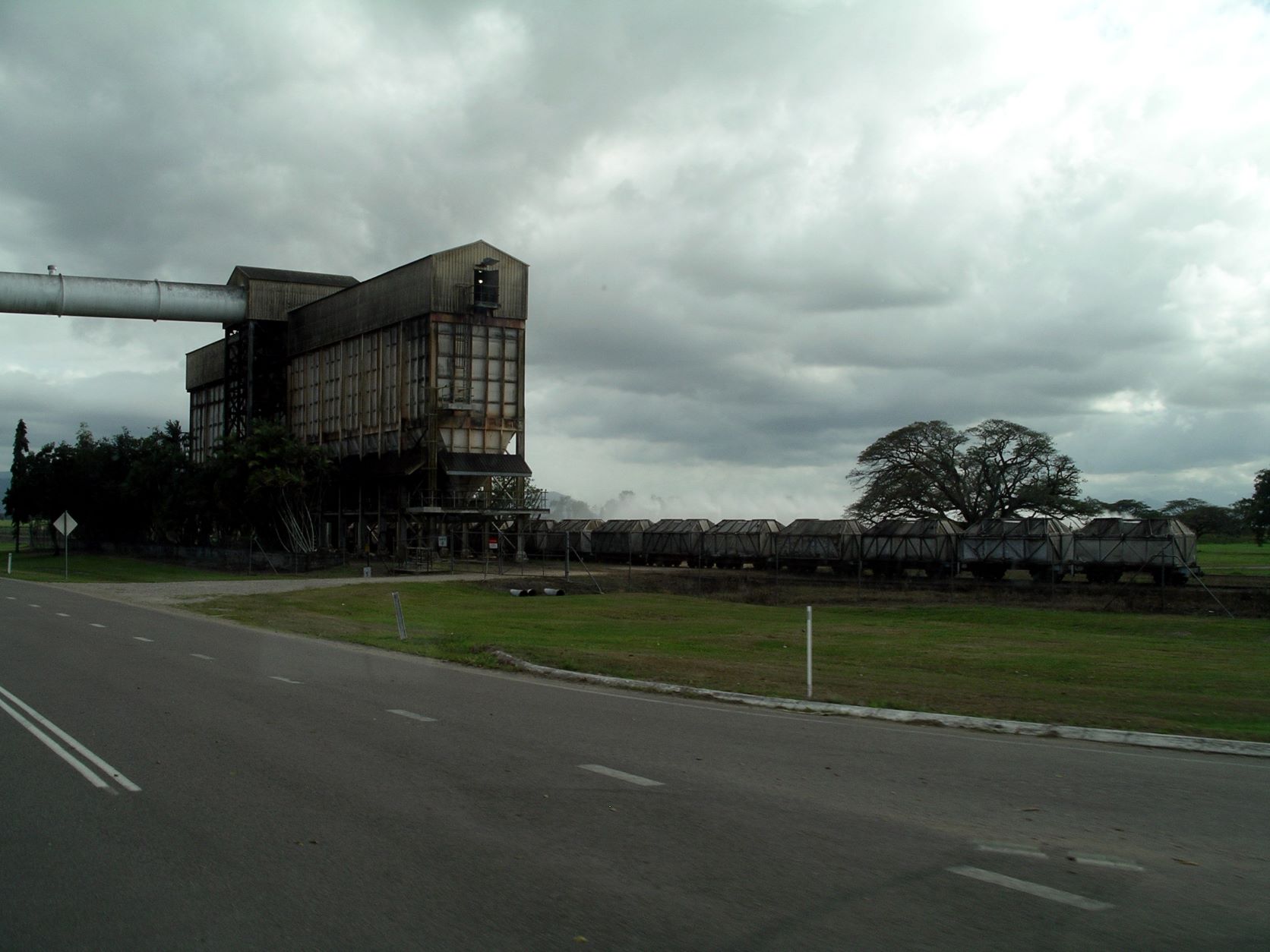 At Victoria Mill, an overhead conveyor takes the processed sugar from the mill, across the road to tall silo like structures at the train loading facility.