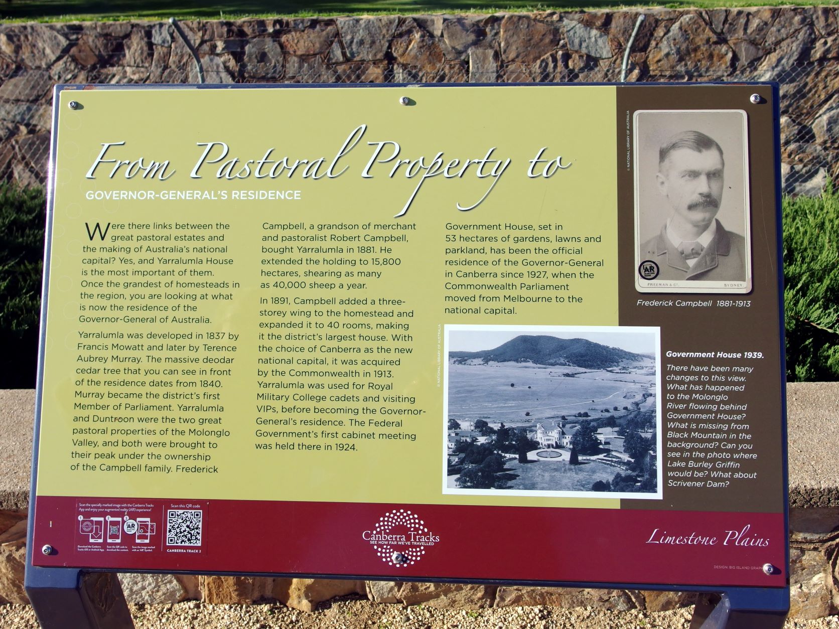 Again, I found new information: that Yarralumla was not purpose built, but was originally a private residence of major pastoral families of the district. The original pastoral property was a large one. Walter Burley Griffin, the designer of Canberra, had included in his plans a grand vice-regal residence, but – as with quite a bit of his original plans – a cheaper option prevailed.