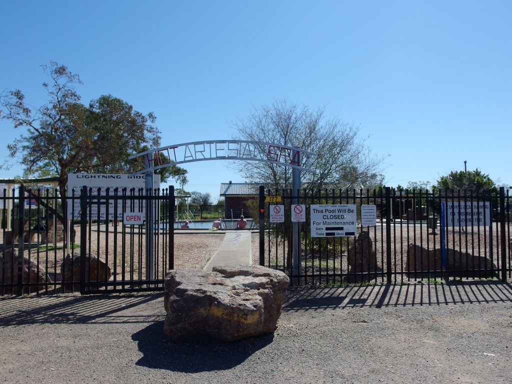 The flow of this bore is now controlled, so the flow quantity is reduced, but there is still sufficient through flow to keep the waters hot and clean. By the caravan park fence that is closest to the Baths, there is a large dam, which I thought contained some of the outflow water from the Baths. This was directed off for use by miners in the dirt washing process that was part of opal mining.