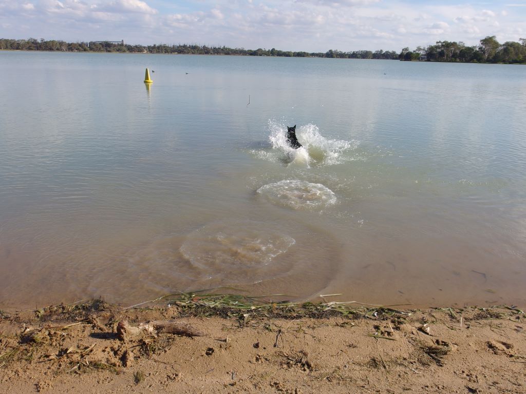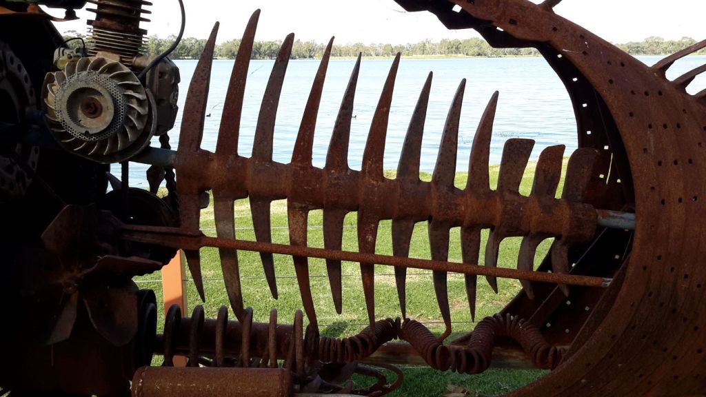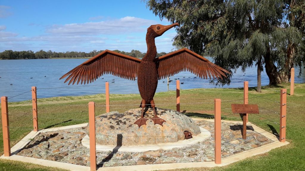 Another “artistic” trend in these parts seemed to be to build representative installations on roundabouts. We had seen some in Warracknabeal that honoured working dogs and dingoes. In Minyip there was an installation meant to highlight the role of wheat in the district – a farmer kneeling down, and sprouting wheat grains. Unfortunately, the pale green “sprouts” made me laugh – they were very suggestive! I had to get a photo of that, and John drove a couple of times around the roundabout for me – somewhat to the mystification of a couple of locals.