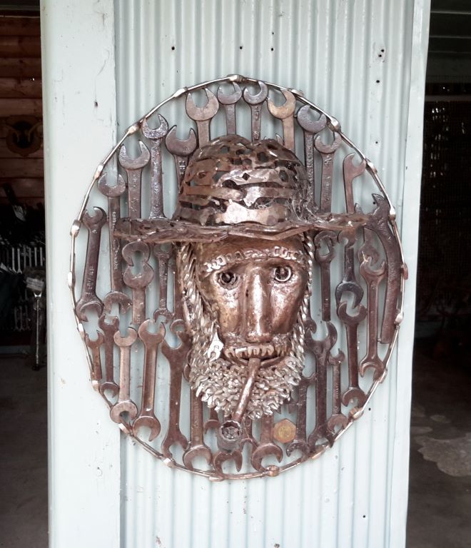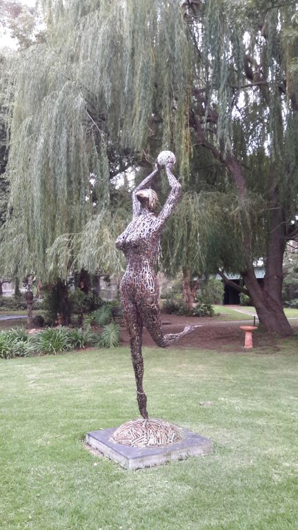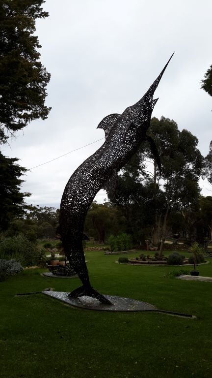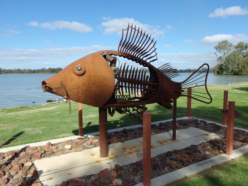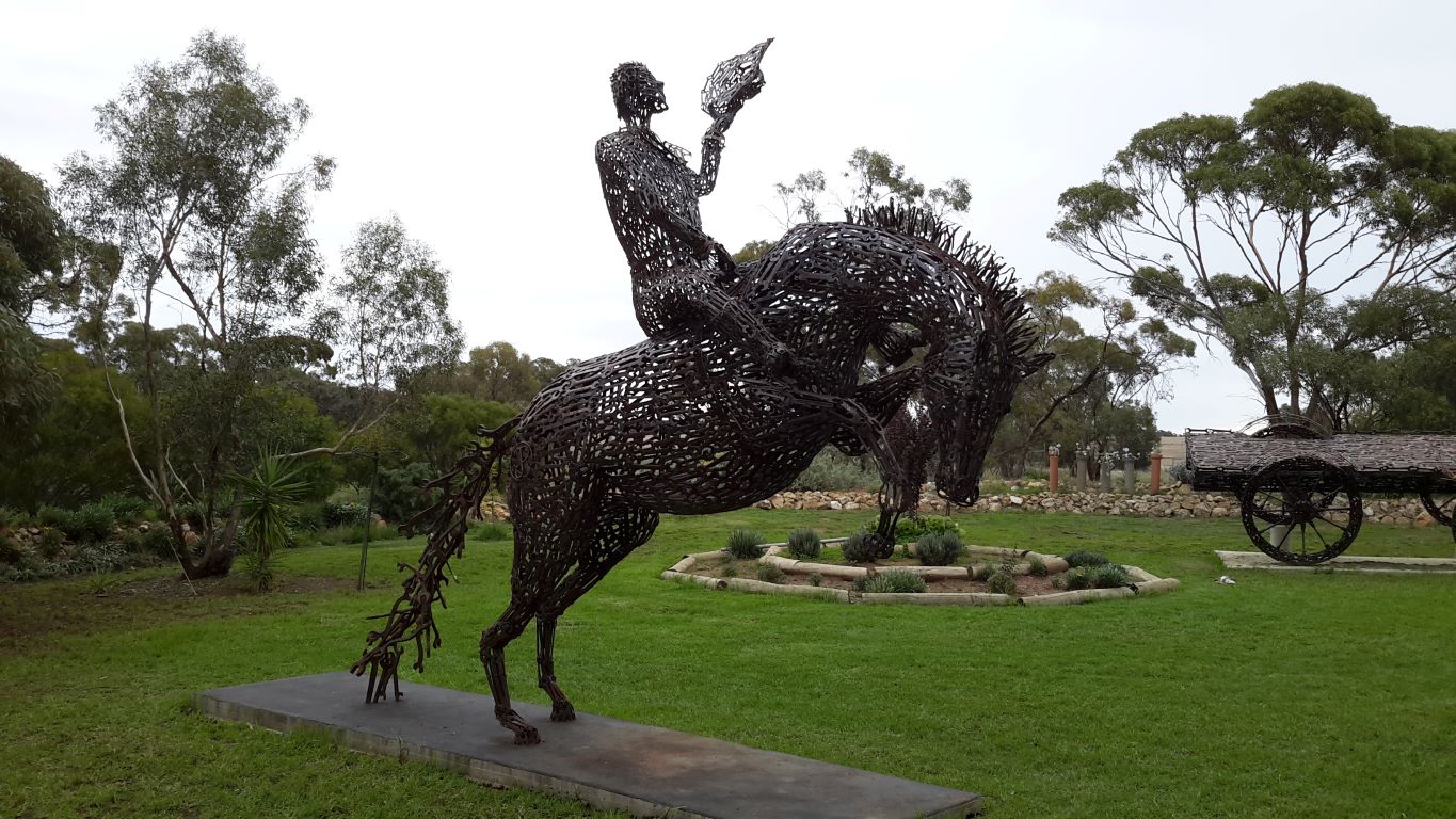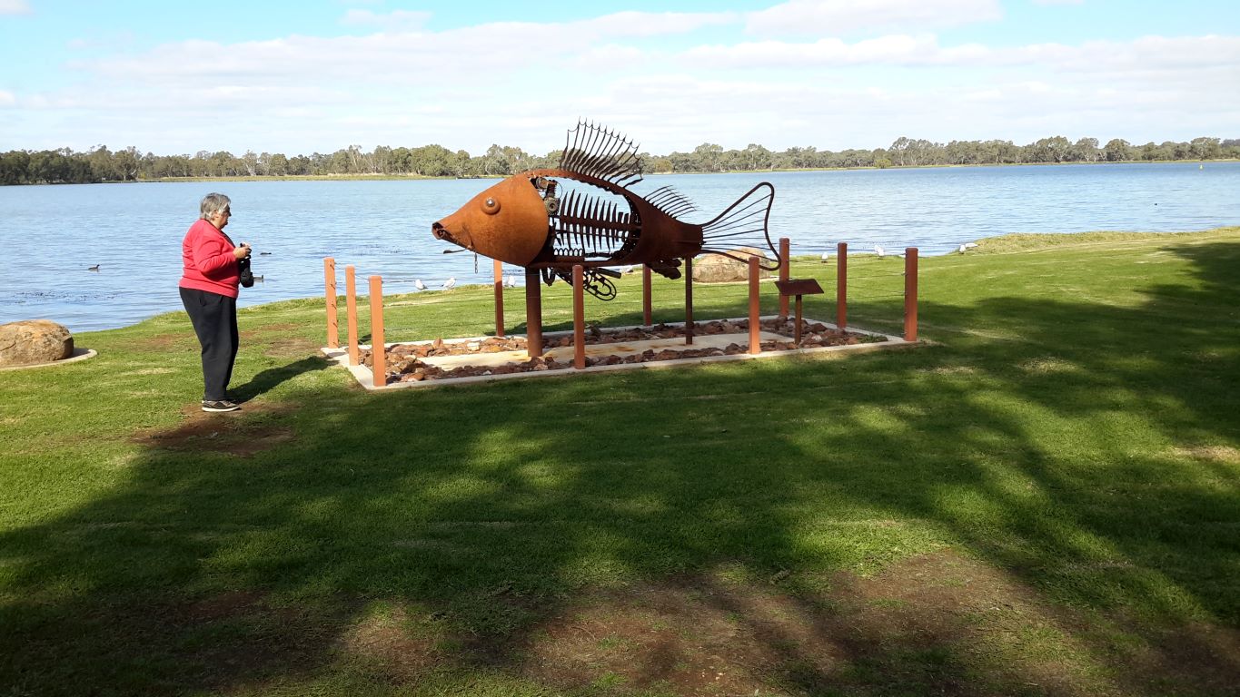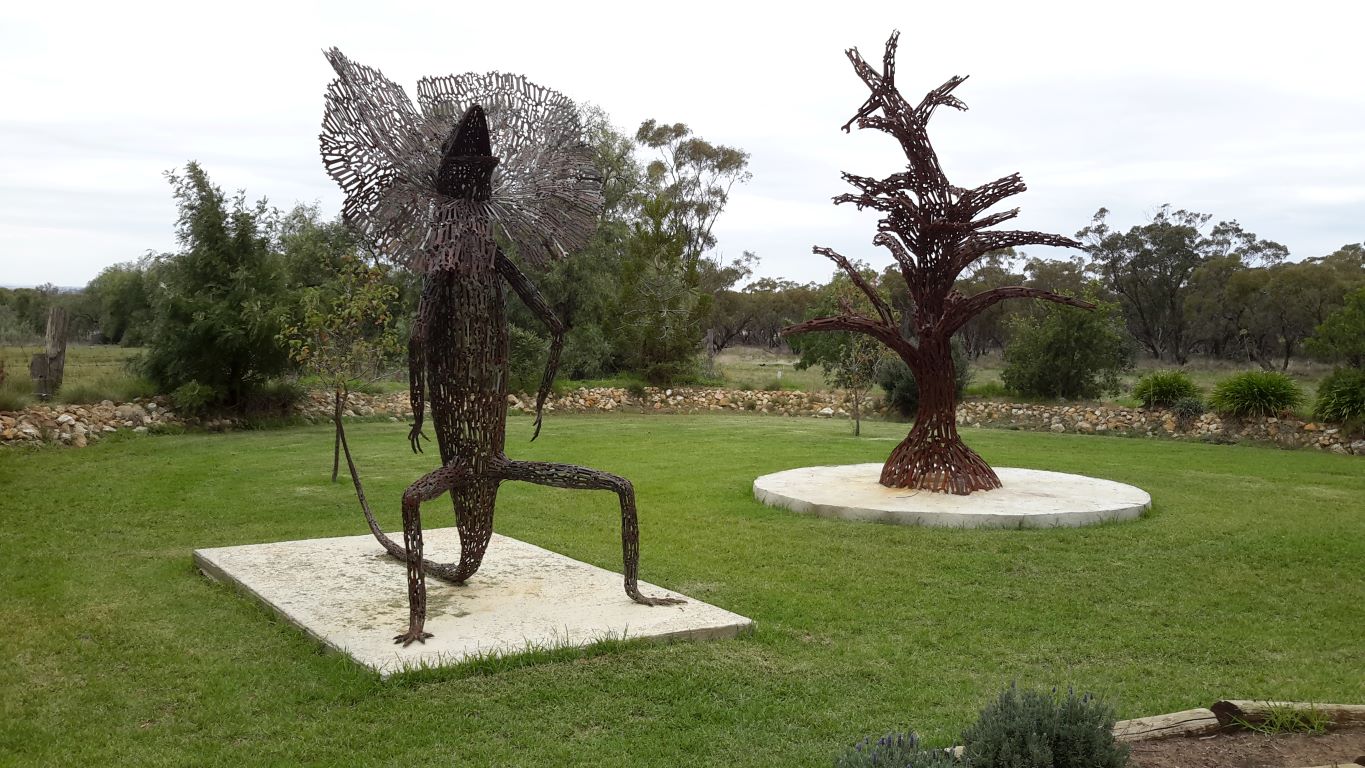 Another “artistic” trend in these parts seemed to be to build representative installations on roundabouts. We had seen some in Warracknabeal that honoured working dogs and dingoes. In Minyip there was an installation meant to highlight the role of wheat in the district – a farmer kneeling down, and sprouting wheat grains. Unfortunately, the pale green “sprouts” made me laugh – they were very suggestive! I had to get a photo of that, and John drove a couple of times around the roundabout for me – somewhat to the mystification of a couple of locals.