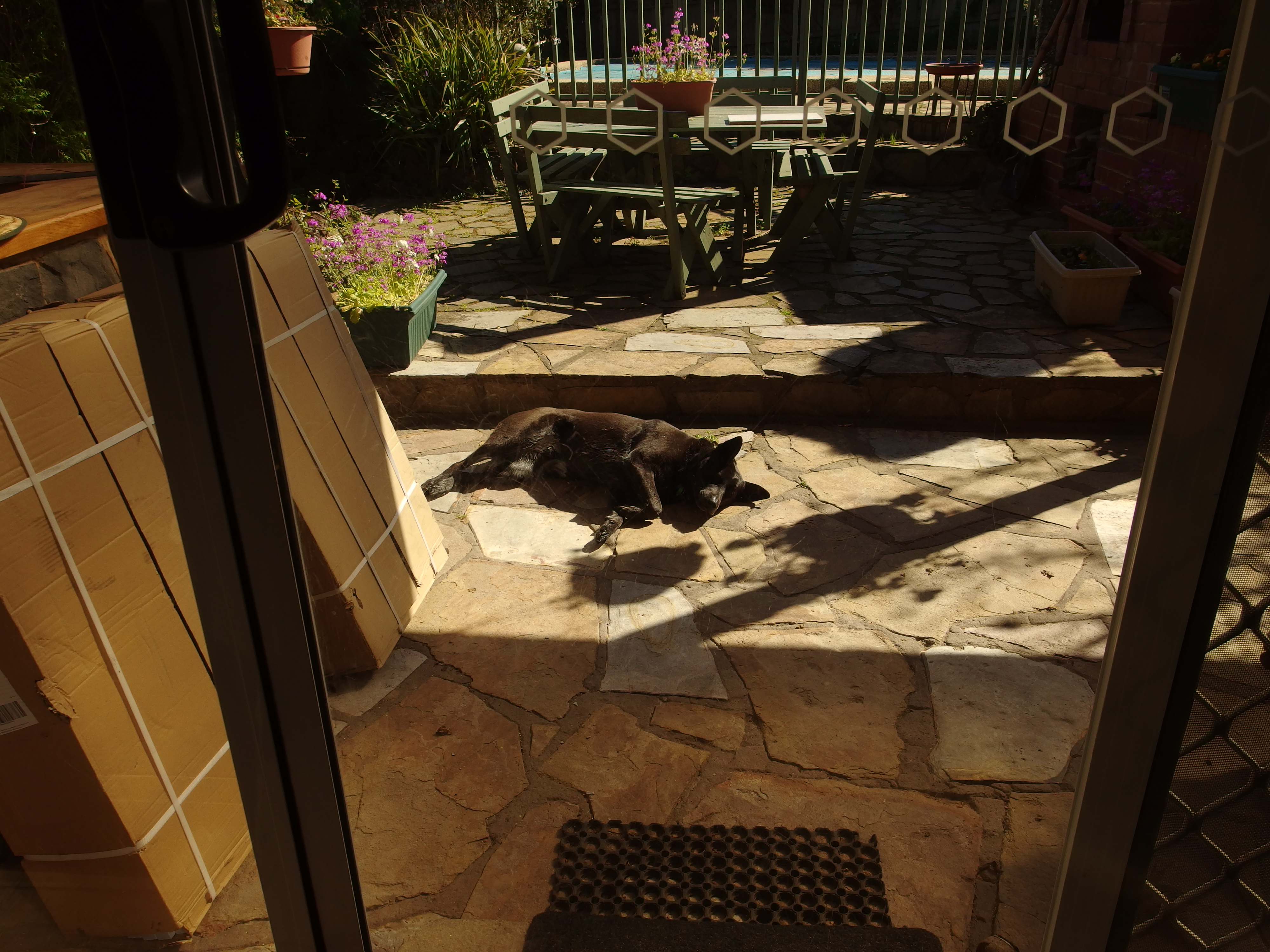 Just to cap it all off, when I first opened the house, there was a dove flying around inside! It was rather frantic to get out and eventually flew out one of the doors I opened – but not before leaving assorted feathers and other mementoes behind. Judging from those leavings, it had been inside for days and perching mostly on the top rail of the vertical blinds in the family room. Luckily for it, there had been a bowl of dog water in that room. I remembered that I’d arranged for friend M to come last weekend to fill the bird baths, water the pot plants plants and pick herself a good quantity of the figs ripening on our tree. Turned out she;d forgotten to bring a bag for the figs, and used her house key to come in and get one, leaving the house open while she picked fruit. The bird must have decided to explore then and become shut in – four days ago.