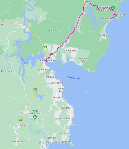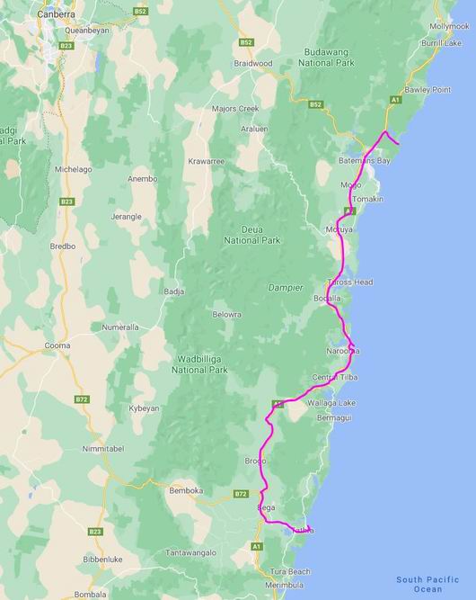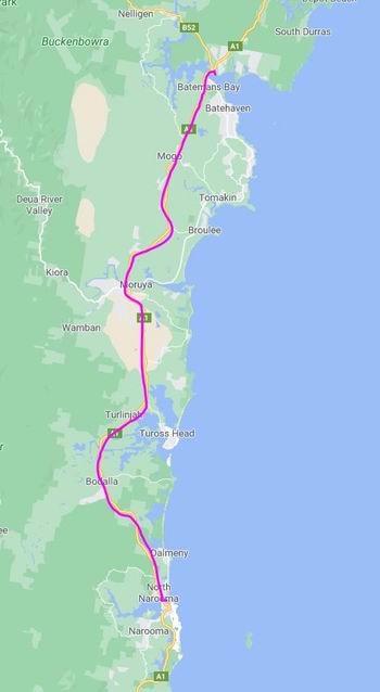 Then it was a fairly slow trip north, from Bega, as the highway was hilly and winding for much of the way. We passed through south coast towns that we would, hopefully, come back to visit on the way home, or on later trips – Narooma, Moruya, Batemans Bay.