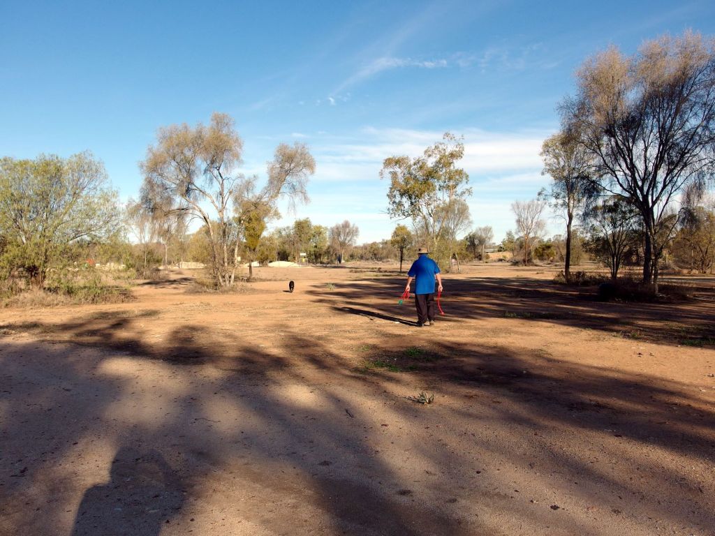 They also had a few cabins, a good camp kitchen, BBQ area and swimming pool (despite being within walking distance of the Bore Baths). There was an opal fossicking area on one boundary. John found out that we could give Couey ball throwing exercise off in the bush area near that, right away from the main park area. They also offered doggy day care, if we wanted to go off on tours.