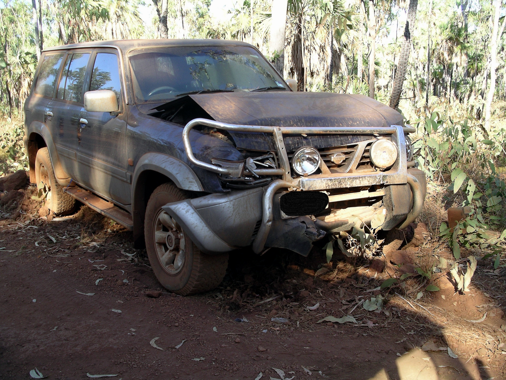 Came across the mangled vehicle, still beside the track. He’d made a fair old mess of it. Judging by the big skid marks on the track, it had been on its way into the campground and Falls. It had been pushed to the side of the road, awaiting collection.