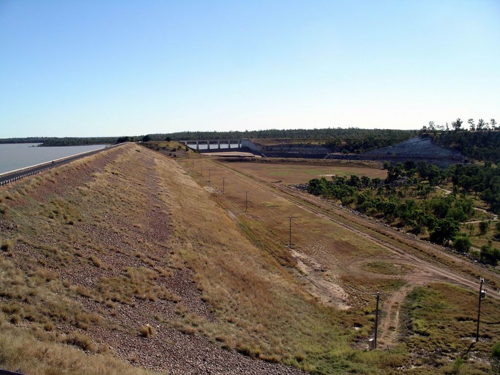 The road crosses the top of the Fairburn Dam wall, which created the large Lake Maraboon on the Nogoa River.