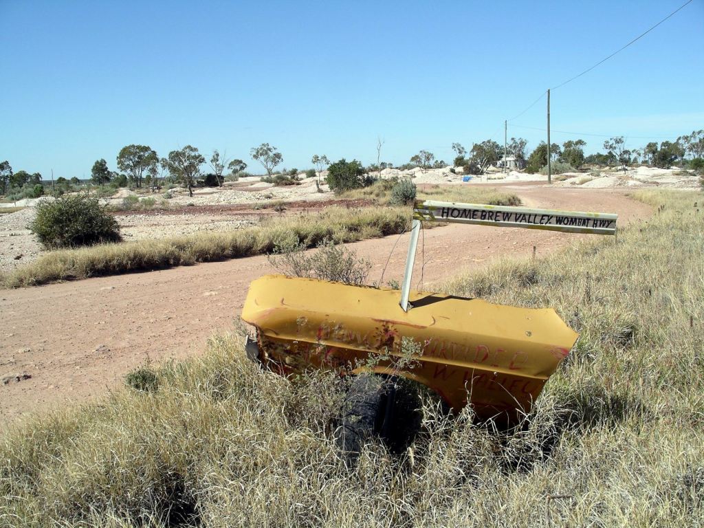 We headed out of town to the highway. Stopped at the highway corner to inspect the tarted-up “agi” that is the feature of the welcome signs. An agi is an old cement mixer, used to wash the opal dirt and so make separating out any opal bearing rock easier. There are lots of these on the fields.